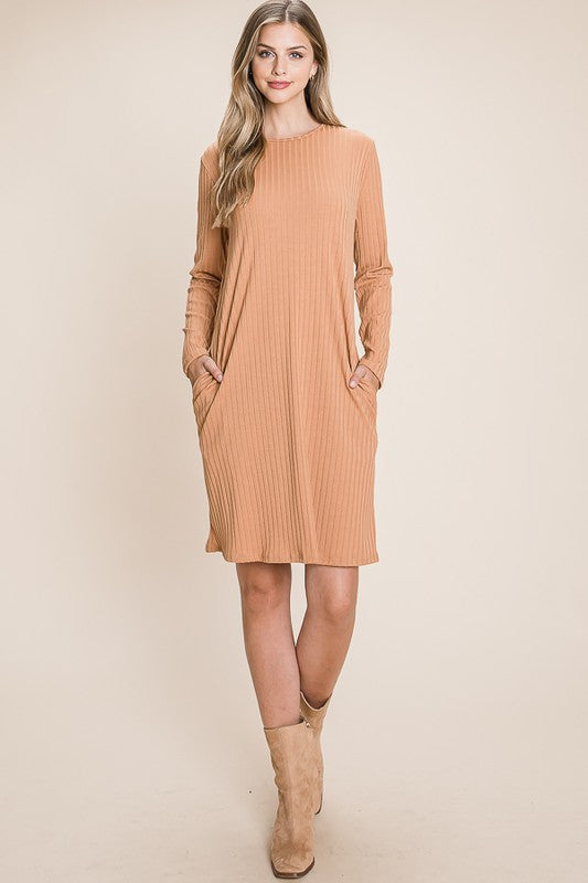 The Round Neck Long Sleeve Ribbed Knit Dress is a versatile and classic wardrobe staple. The round neckline offers a timeless and flattering look. Made from ribbed knit fabric, this dress provides texture and comfort while hugging the body in all the right places. With long sleeves, it is perfect for cooler weather and can be easily dressed up or down for various occasions. This dress is a versatile piece that can be styled in numerous ways to suit your personal style.