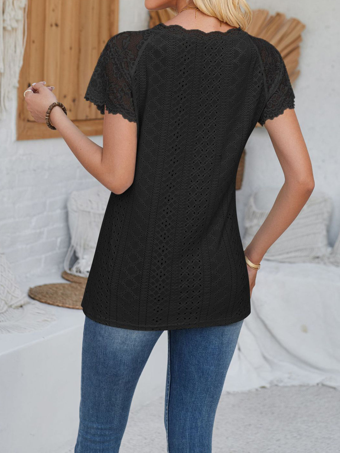 • Eyelet Lace Detail V-Neck Short Sleeve Top