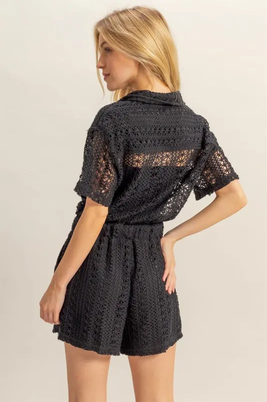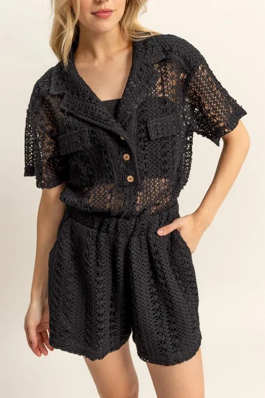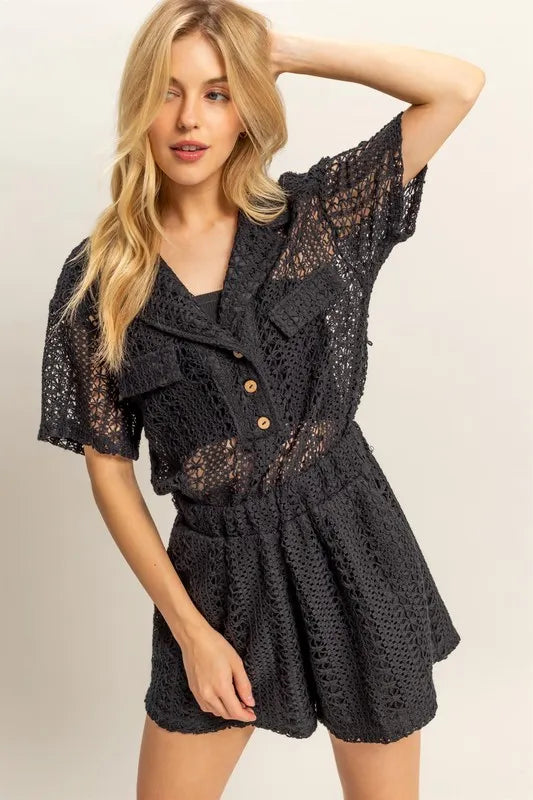 The Crochet Button Front Short Sleeve Romper is a charming and bohemian-inspired piece for your summer wardrobe. This romper features a delicate crochet design that adds a touch of whimsical texture to the look. The button front detail offers a vintage and feminine touch, while the short sleeves keep it light and airy. Perfect for a day at the beach or a casual outing, this romper is both stylish and comfortable, making it a versatile choice for the season.