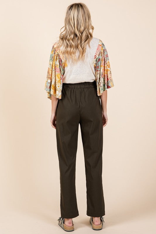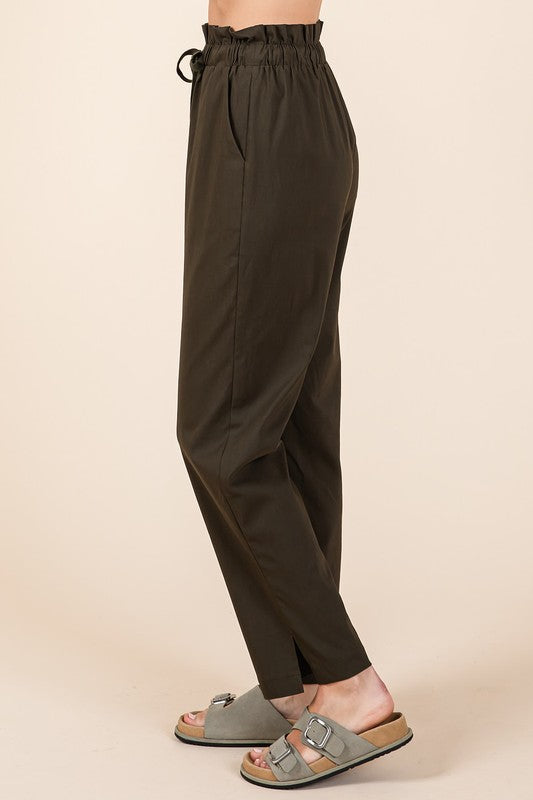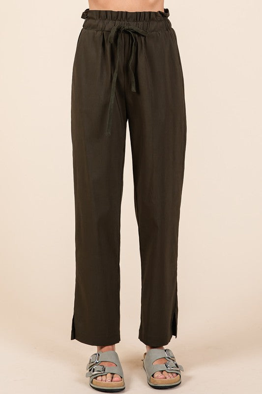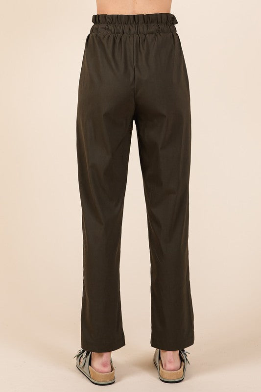 Paperbag Waist Tapered Straight Pants feature a stylish high waist with a unique paperbag detail. The tapered straight leg design creates a sleek and modern silhouette. These pants are perfect for dressing up or down, making them a versatile and trendy wardrobe staple.