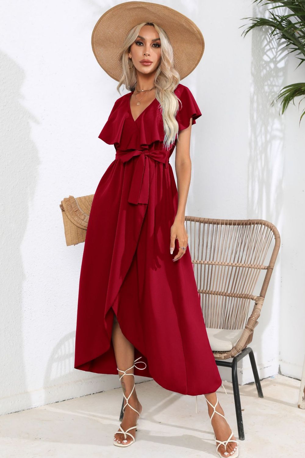 • Tied Front Ruffled Short Sleeve Midi Dress